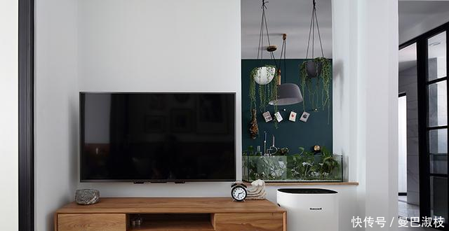 電視墻后面和餐廳相連,旁邊的門洞上放置一個(gè)玻璃盆用來(lái)養(yǎng)綠植,天花上也安裝了懸掛養(yǎng)綠植的花盆,簡(jiǎn)單的小角落,讓家里增添了不少特色。
