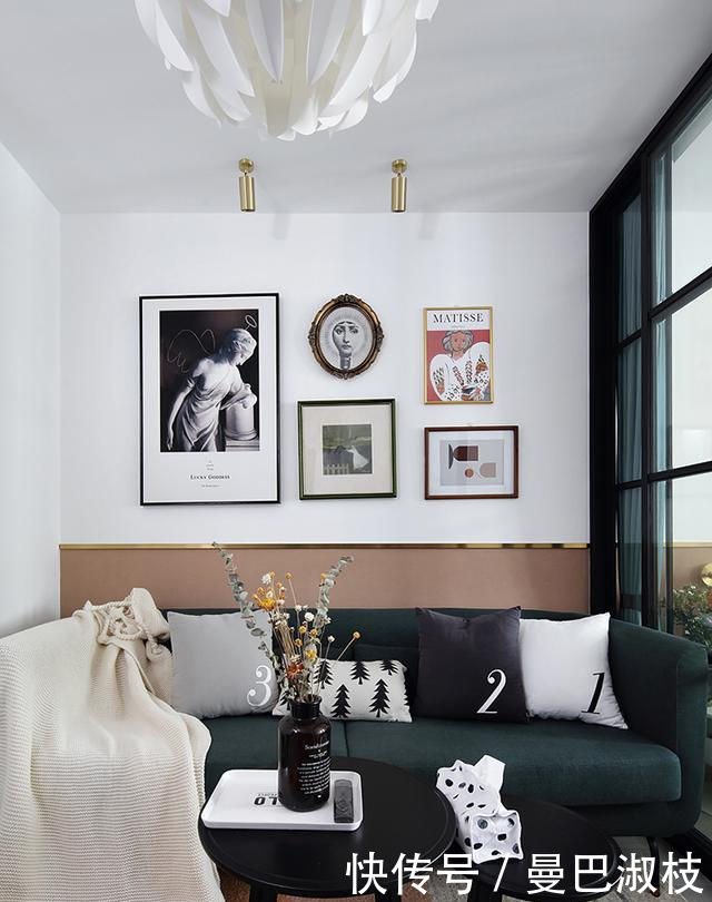客廳本來(lái)的格局空間是很大的,不過(guò)后面業(yè)主覺(jué)得太浪費(fèi)了,只選擇了留下一小部分空間。沙發(fā)區(qū)買的綠色雙人沙發(fā),搭配三色的地毯更顯小清新。背景墻用幾幅裝飾畫進(jìn)行點(diǎn)綴,讓墻面不會(huì)太單調(diào)。