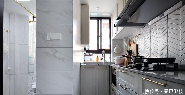 一墻之隔的廚房設(shè)計(jì)成開(kāi)放式,這樣會(huì)讓本身并不大的廚房看起來(lái)更加寬敞些。別看廚房面積不大,不過(guò)收納和功能都很齊全,地面瓷磚的花色拼接也讓小空間充滿了設(shè)計(jì)感。